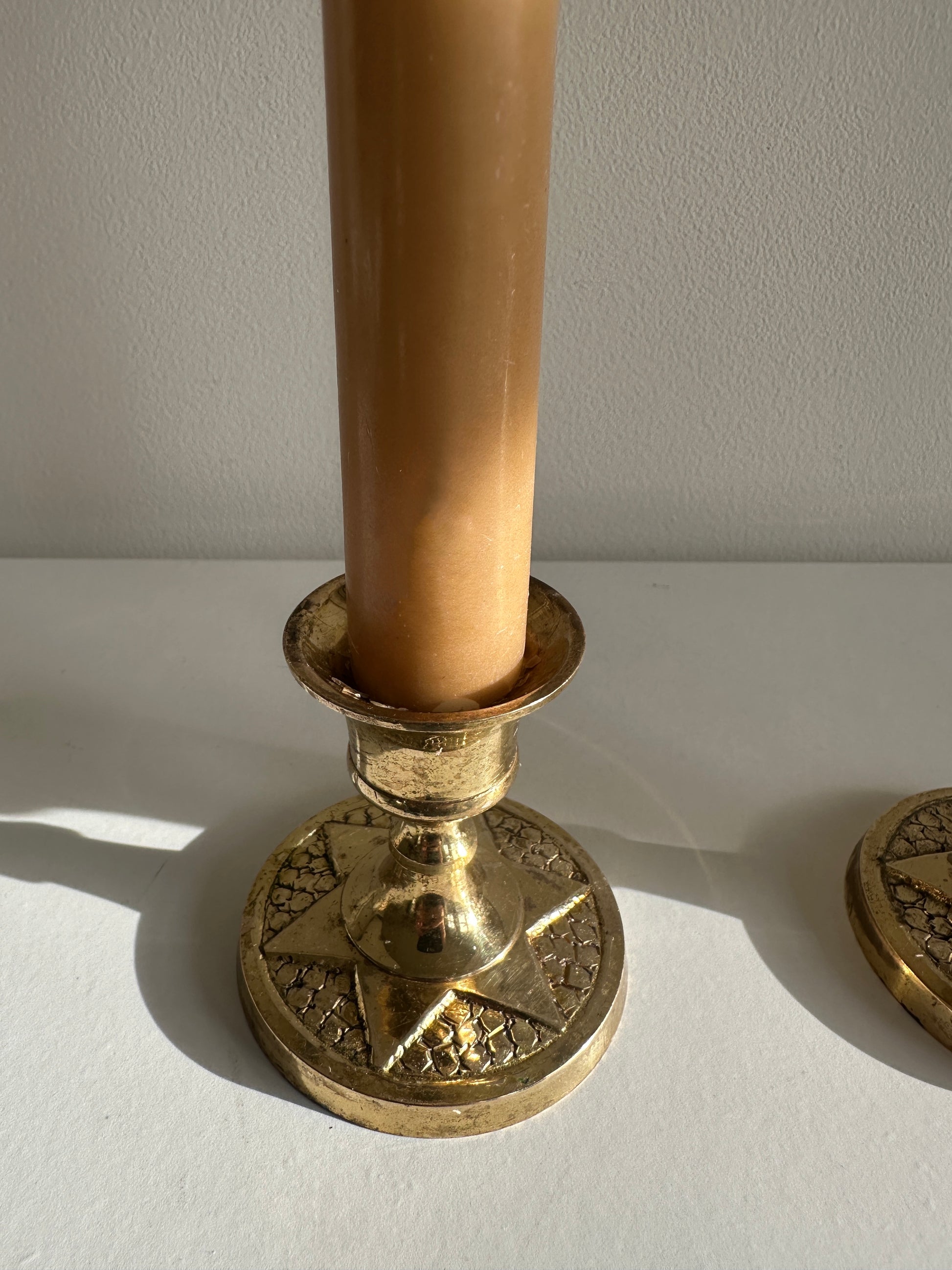 This vintage pair of Swedish brass candleholders features a sweet star/celestial sun–embossed design and are crafted to hold standard tapered candles. They show some age-related marks throughout, however these don’t detract from their aesthetic and instead add to their character and charm.