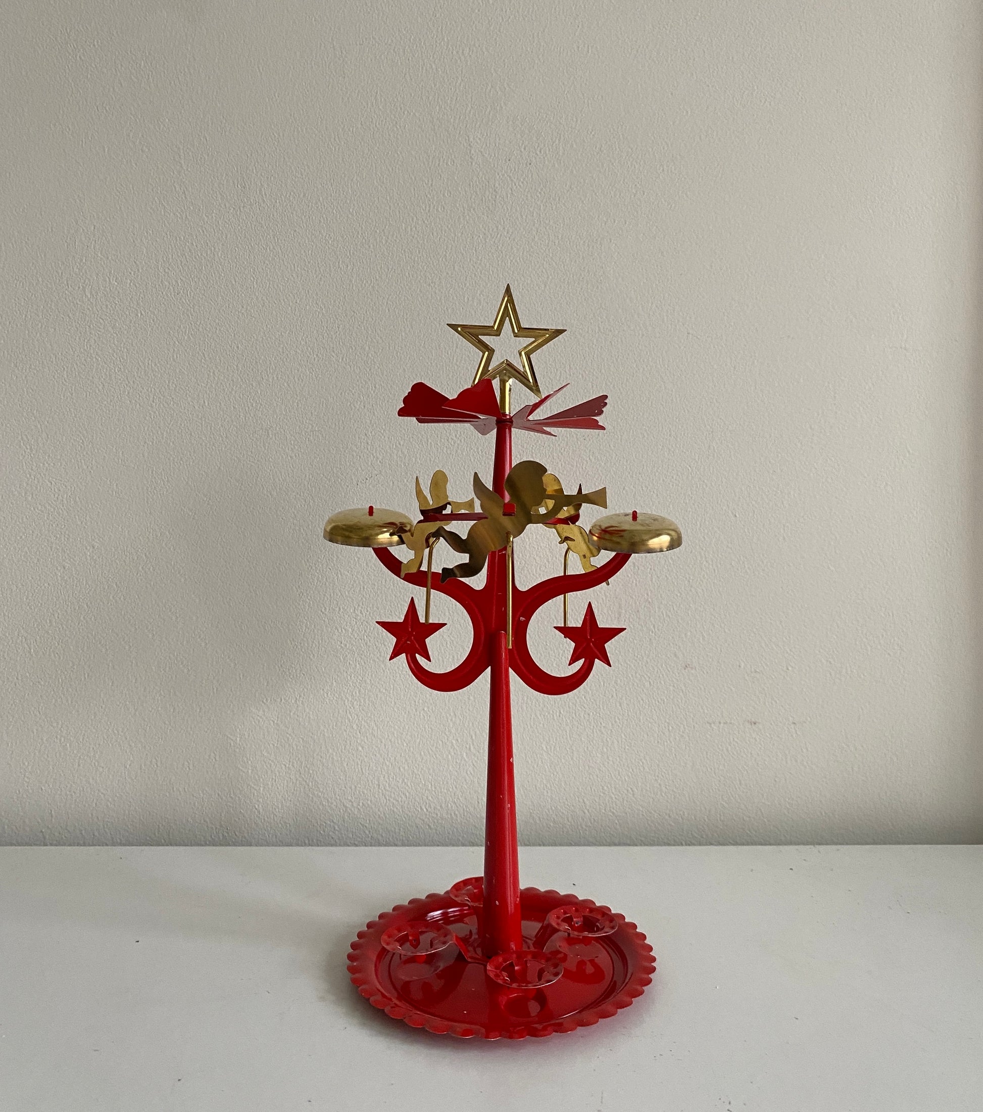 Bring nostalgic charm to the festive season with these vintage brass-plated angel chimes, featuring a double-star design in a rare red and brass colour combination. Designed for four slim, short candles, the warm air from the heat sets the angels gently turning, creating a soft, delicate bell sound.